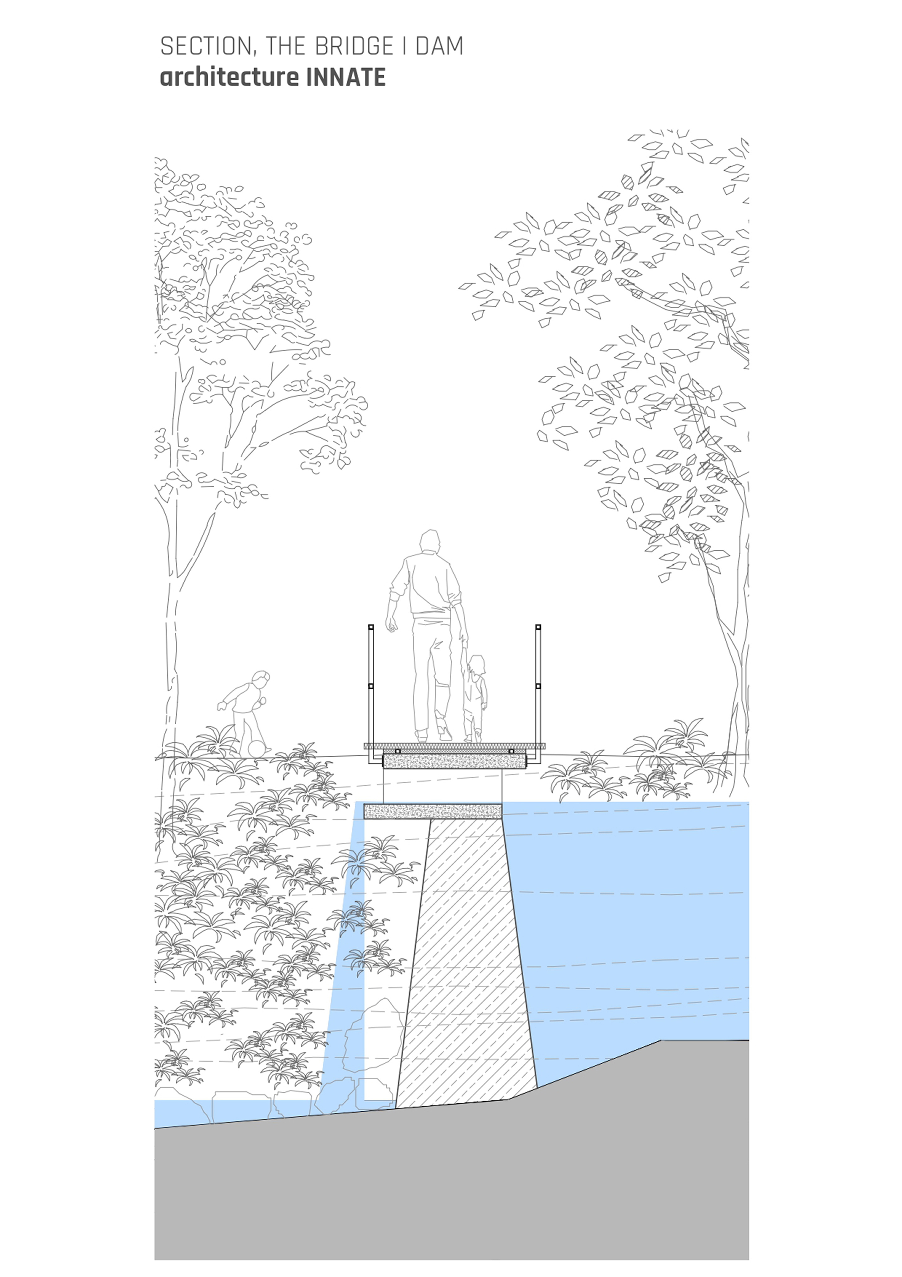 A bio-swale is not always a pleasant water infrastructure. The water level rises and falls with seasons and the catchment area harbours a plethora of wildlife. One can contemplate the bridge being a dry, utilitarian structure in the summer, while engaging with the wetness and the aquatic landscape in monsoon; an architecture of endurance. The waterfall adds an element of joy and play as the swale overflows.