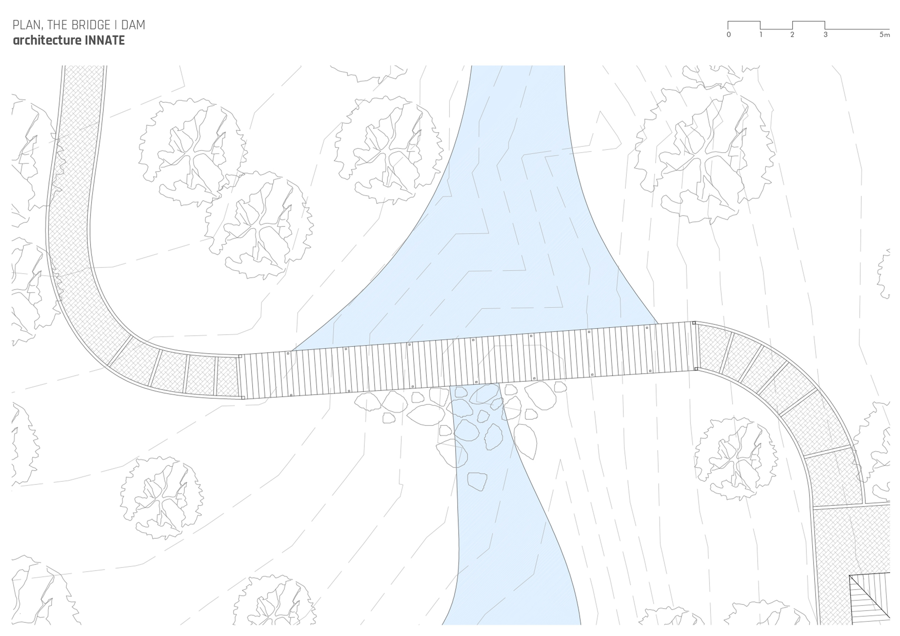 Designed to sit lightly on the edge of a small swale, this infrastructural element enfolds a multitude of experiential and functional agendas: a bridge, a check-dam and a waterfall. It assimilates the water-retention structure with the site all the while holding on its own through a minimal and adept design.
