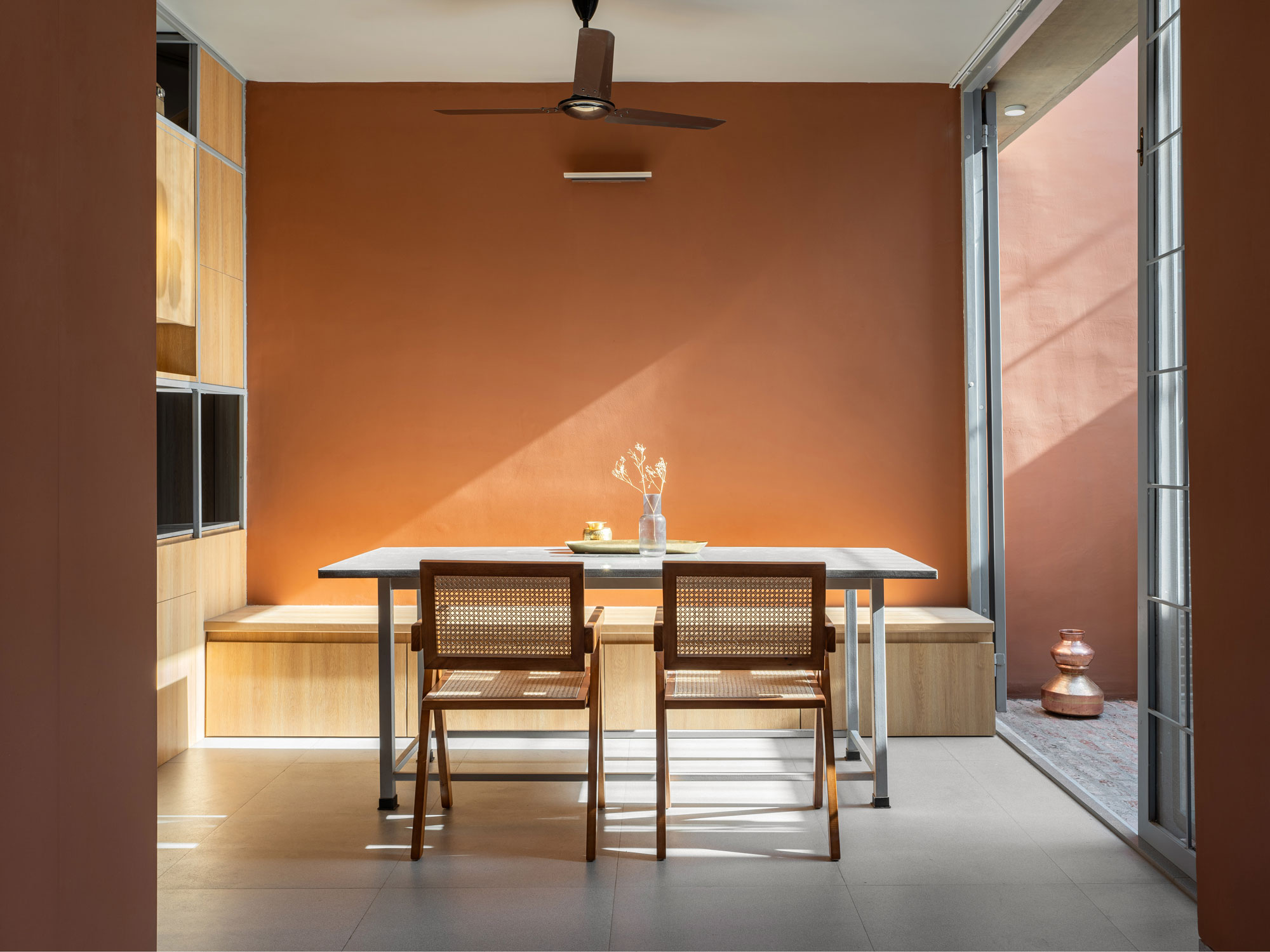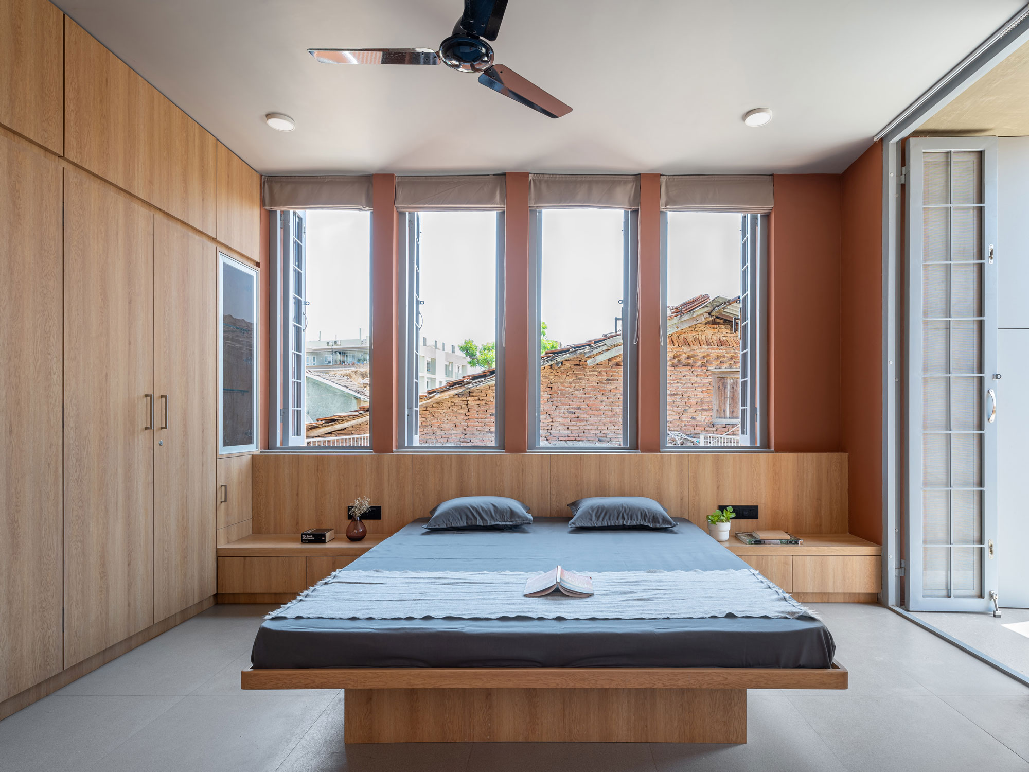 Built with frugality and eloquence, the plan presents a special solid-void relationship where a sequence of built and open spaces with changing enclosure and porosity help navigate the functional aspects in a multitude of permutations and combinations. The house can be closed or open to the street. It presents options of looking into the front or the centre, or the back. The design offers many choices, each with a set of carefully articulated interrelationships.