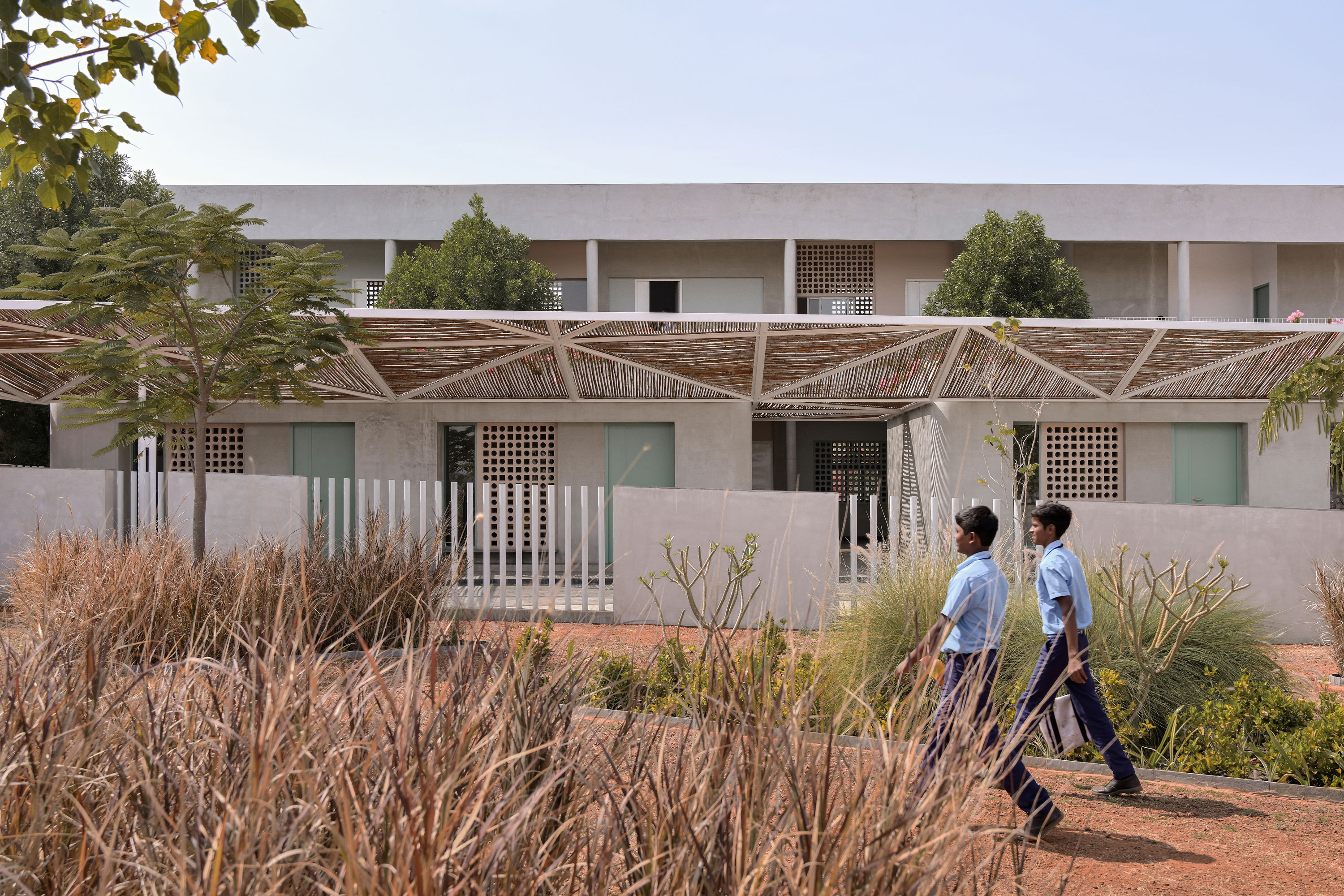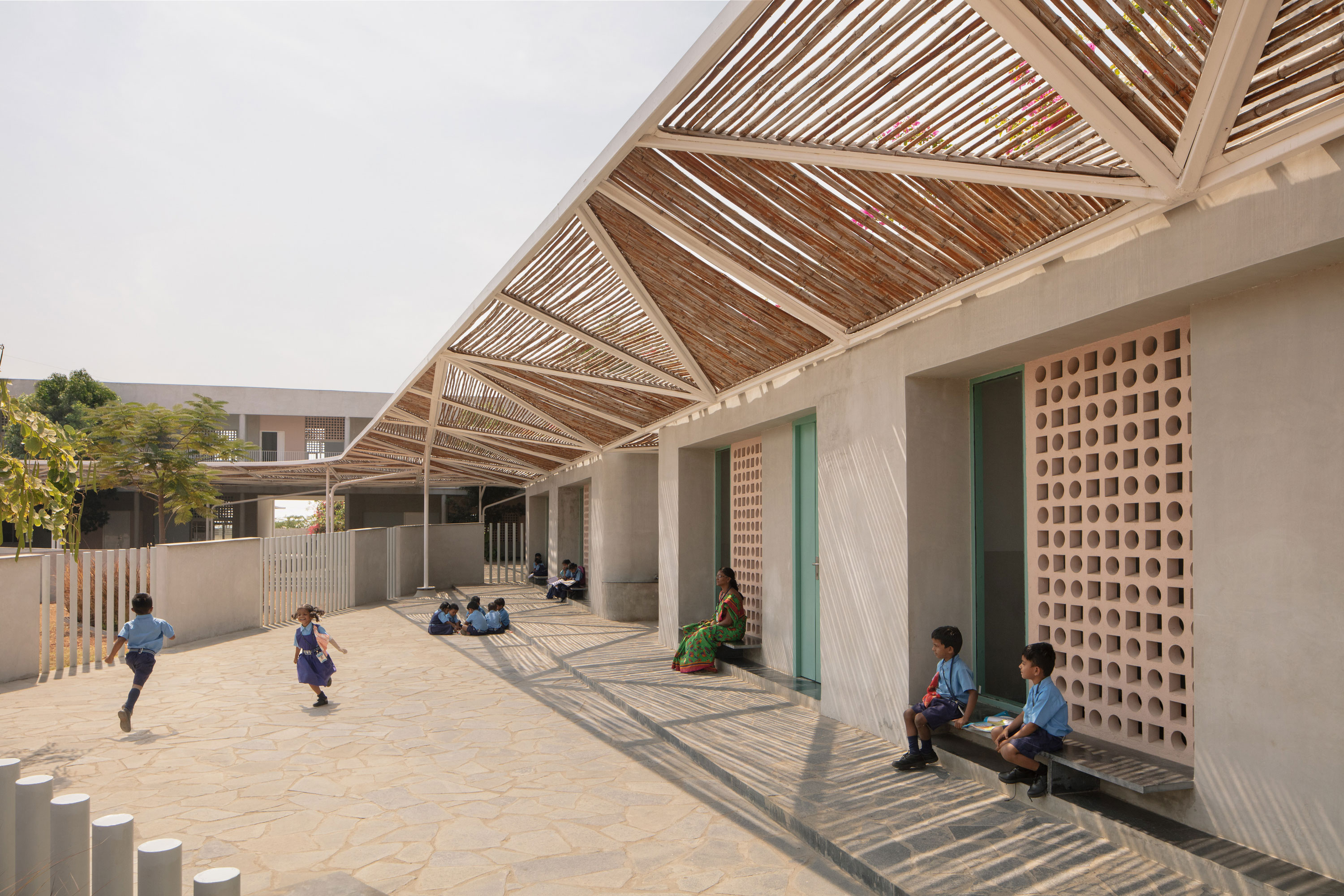 Old school buildings are repositories of memories and nostalgia for the communities that have an association with them. Designed as a rejuvenation project through CSR funding, the architects employ one powerful idea to cohesively bind the space and extend the interiors of the school into a wonderfully articulate outdoors.