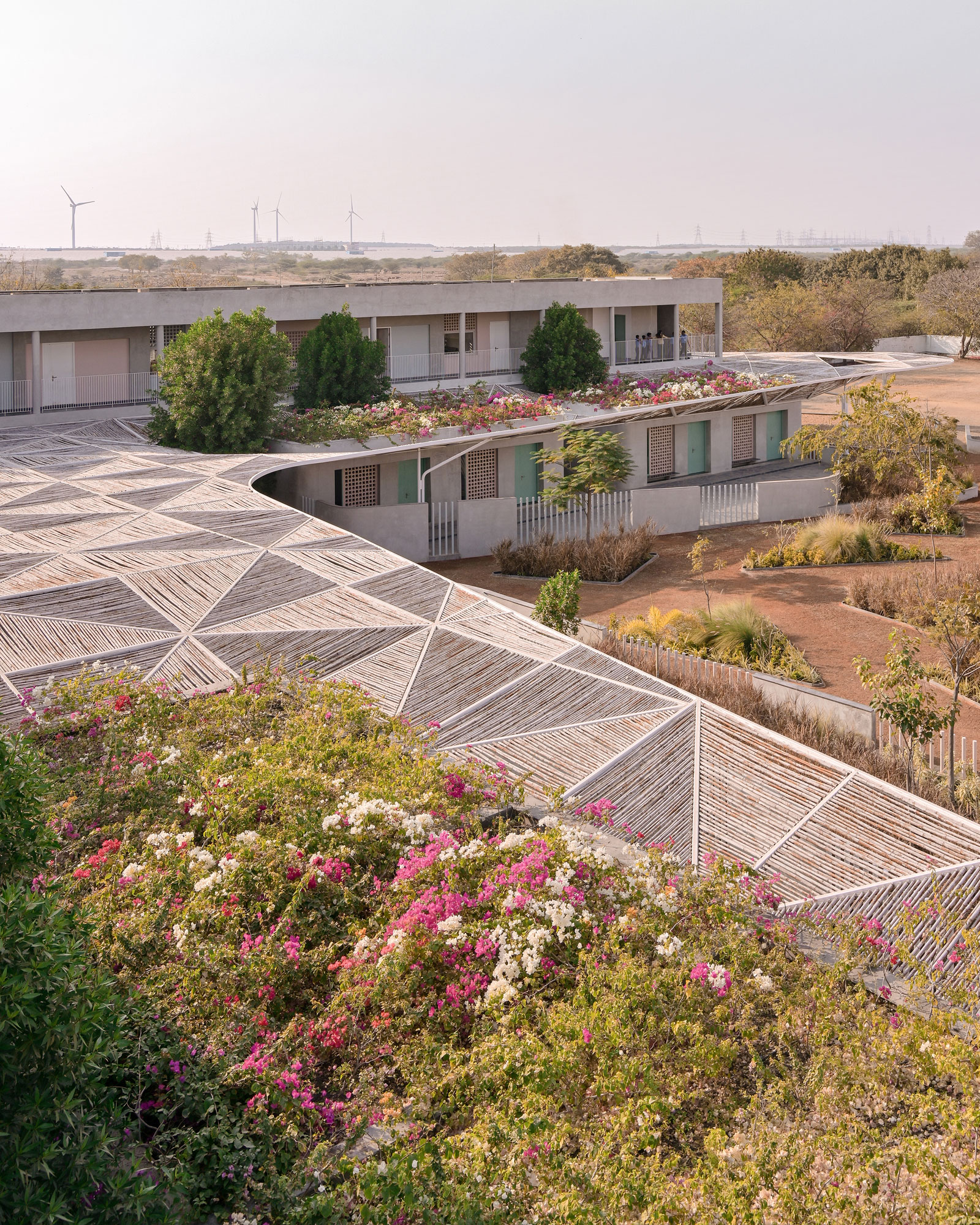 Playing with the hardness of steel and the tactility of bamboo, a singular meandering canopy creates a carpet of shadows on the ground plane. This device works climatically and architecturally towards extending the threshold of the interior space, mitigating the harsh climate and the sharp sun in this context. This extension of the boundary of the building helps build cohesion between the old blocks. The detail is frugal and eloquent.