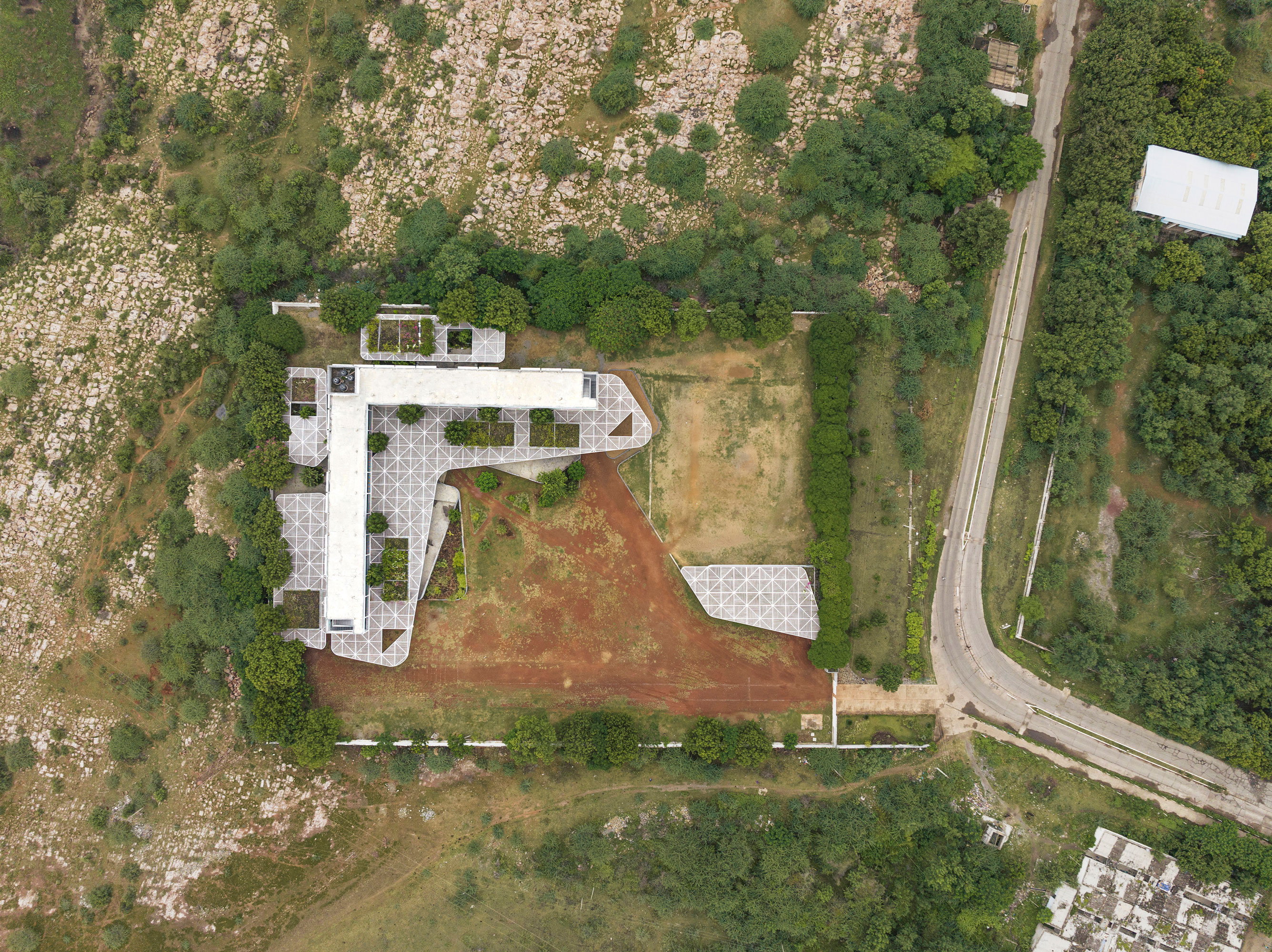 An enclosure thus created combines the canopy, the fenestrations and the compound wall into a singular whole. One can imagine the changing nature of the canopy as vegetation may eventually attach and take over as the connecting tissue becomes the vessel for activity, play and rest.